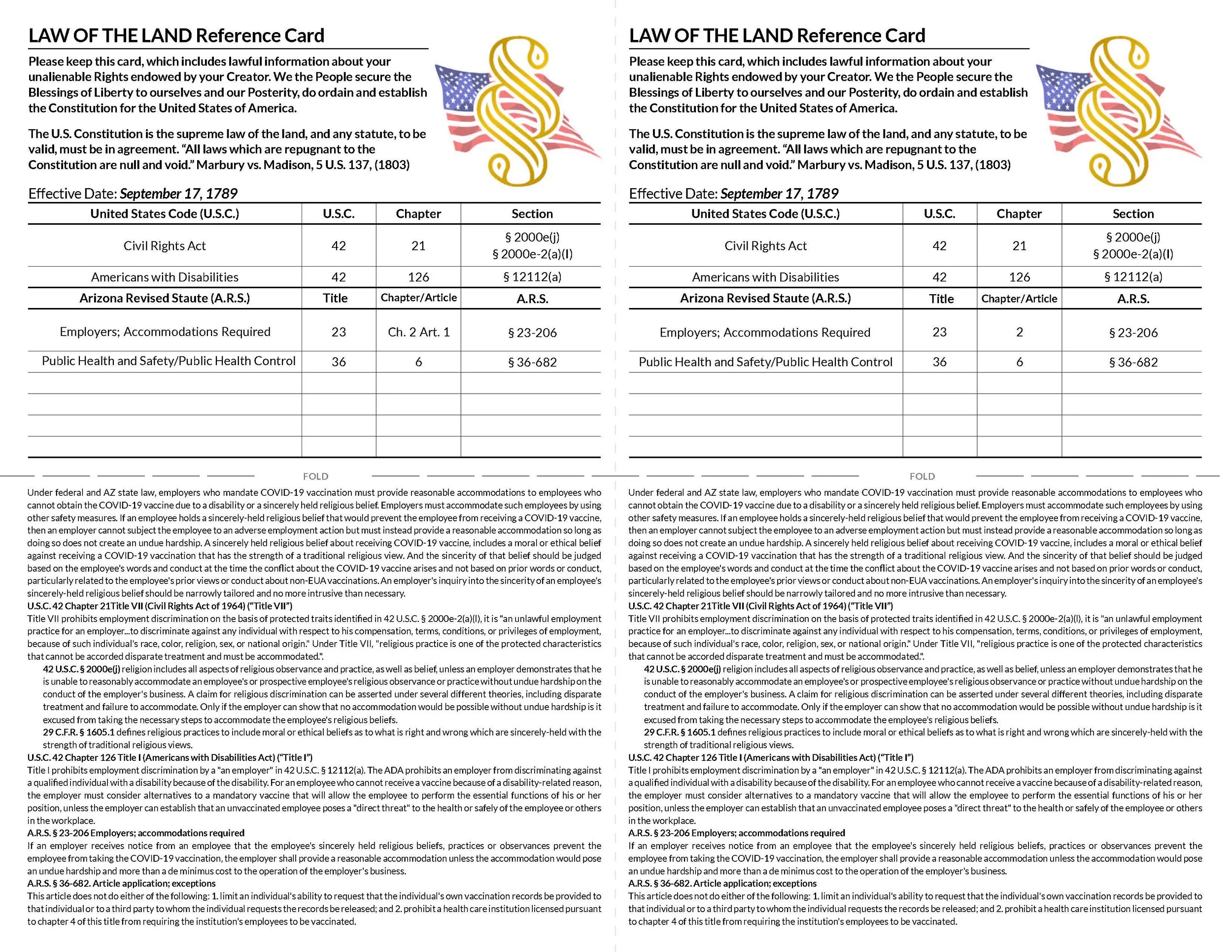 Terror of the Woods has created the LAW OF THE LAND Reference Card for your easy reference to the lawful information to help you fight back against your employer and the government who have dismissed your religious and medical exemptions against the COVID-19 vaccine.